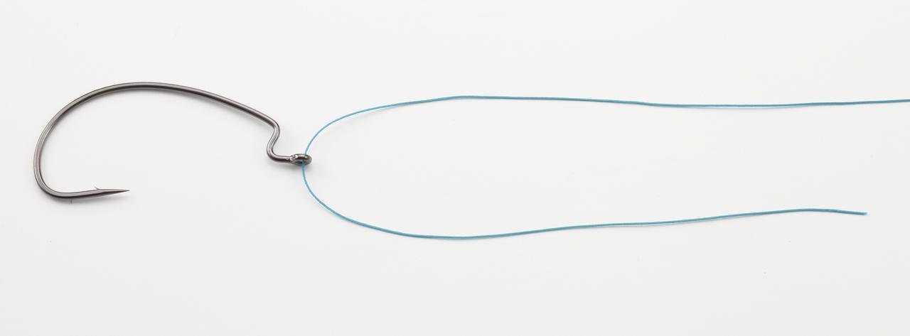 (1)ラインをフックの穴(=アイ)に通して折り返す