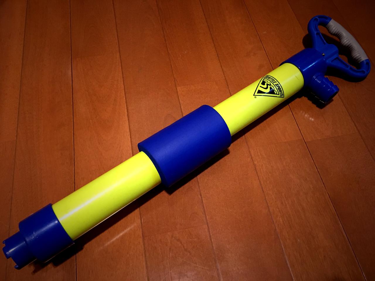 先端を溜まった水に突っ込んでハンドルを上下すれば、あらまビックリ! 猛烈な勢いで上部の出口から水を排出していきます。