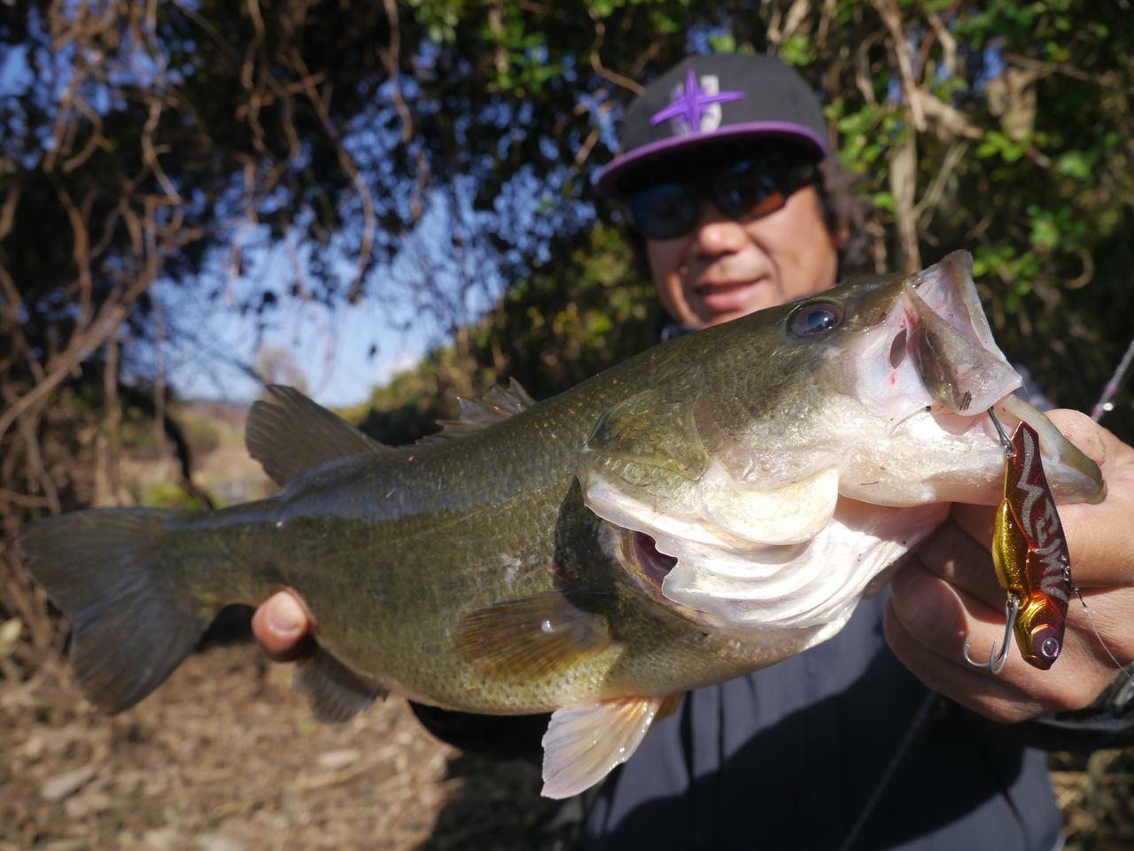 「冬ですからハイシーズンのように、活発に追ってバイトする季節じゃない。バスはルアーに気づいても追うために時間が掛かります。だから超ショートで動かしてルアーがその場から離れて行かないようにしたいし、放置でバスを待ってあげる。ボクらの間では『シャッドキルアタック』と呼んでいるテクニックですね。だいたい5秒も止めてあげれば良いですよ。最長で10数秒でバイトしてきて釣ったこともあります。またここぞ!という場所に置きたいので、フォールが流れるメタルバイブは着底場を定められないので、この釣りに向かないですね」。