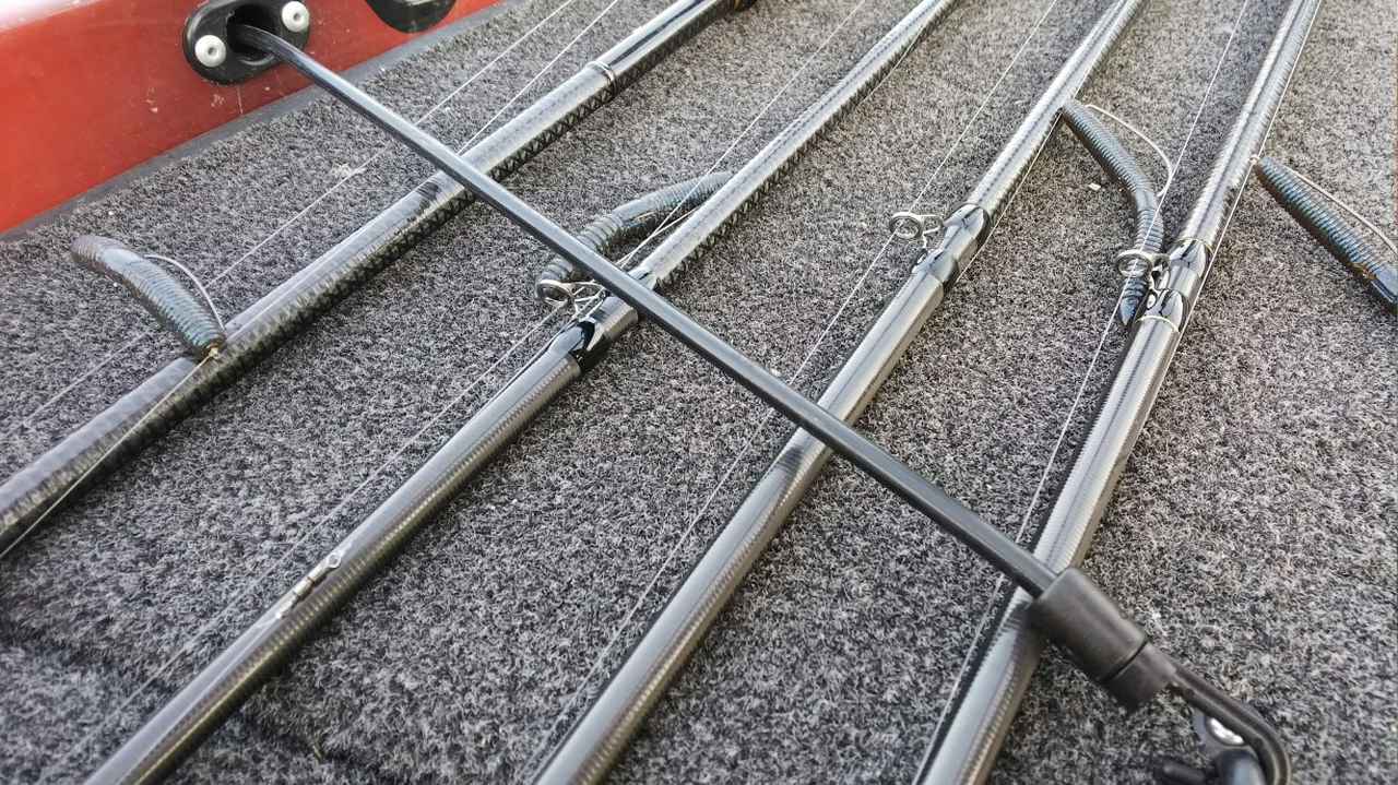 出船前のフロントデッキ。初日はファットウイップ3インチのヘビダンが3本、同4インチプロトで1本だったが、各2本ずつへ変更。