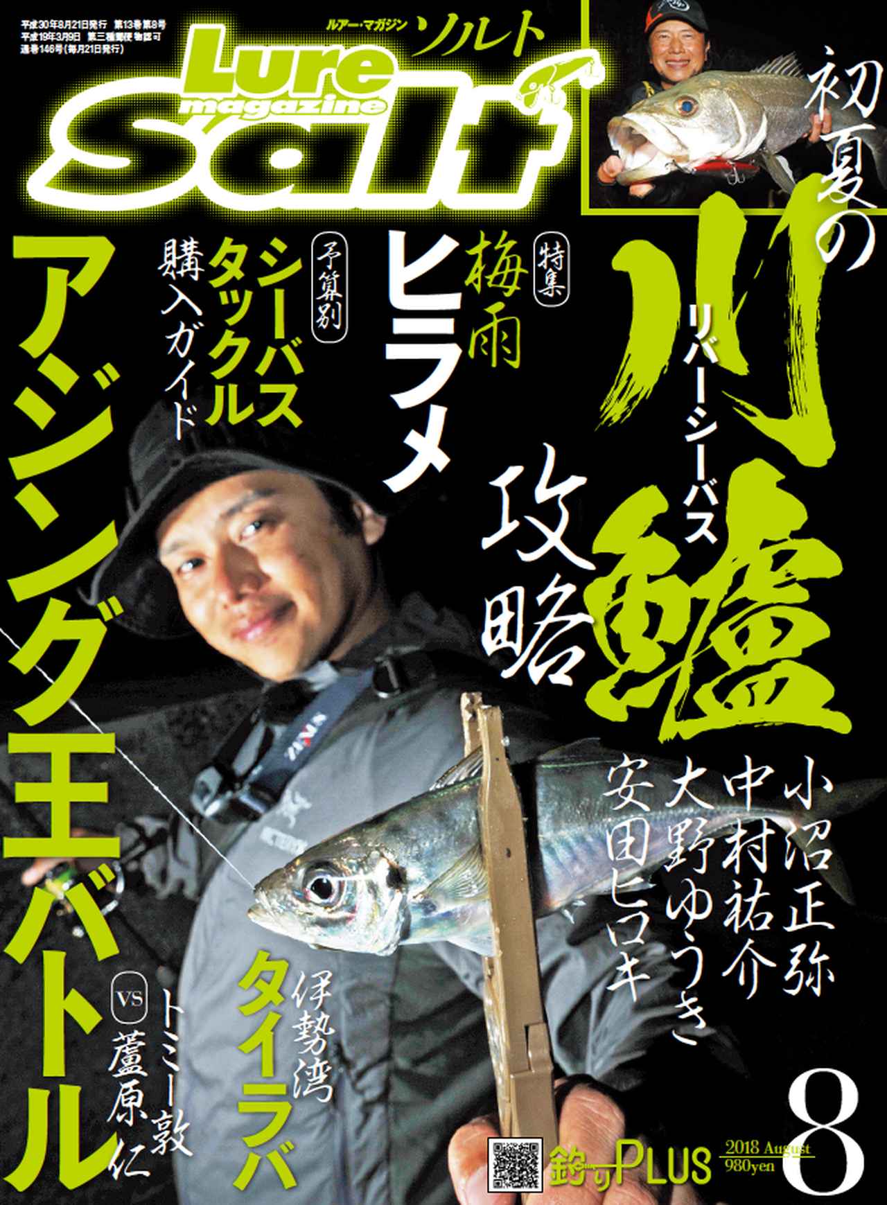 ルアーマガジン・ソルト8月号、好評販売中! 巻頭は「アジング王バトル」第3戦!前回の王者トミー敦氏 vs 蘆原仁氏による激闘をお見逃しなく! 第一特集は初夏のリバーシーバス攻略! 第二特集は絶好釣のヒラメに注目! さらに、ヒロセマンの新連載「ショアジギ研究所」や、敏腕ショップ店員によるシーバスタックルバイヤーズガイドなど見どころ満載!