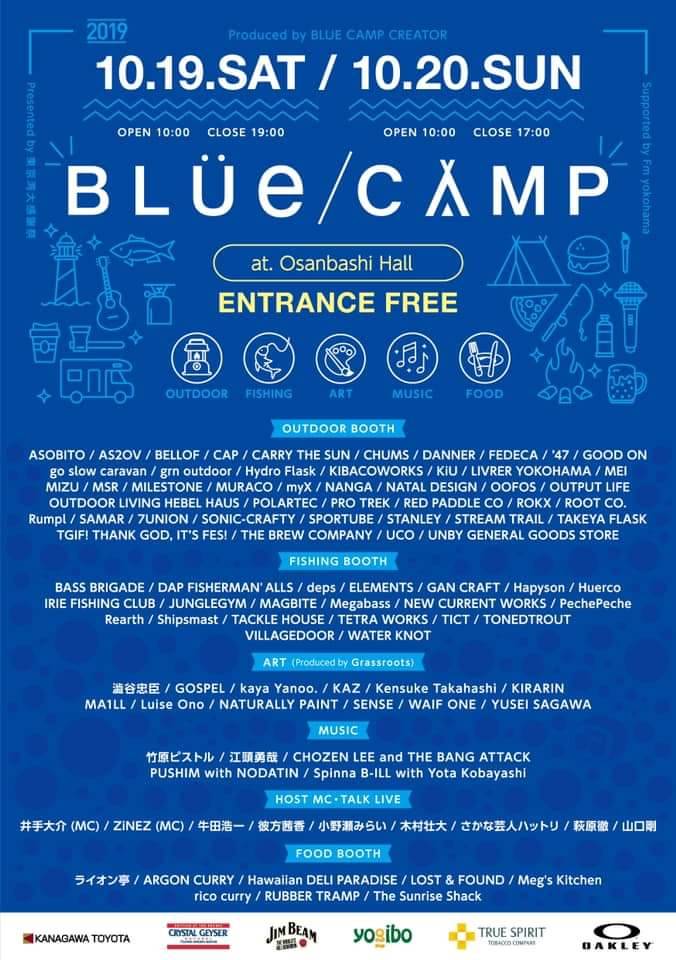BLUE CAMPは、海に囲まれた日本の(未来に向け、海をもっと面白く。)をビジョンに、クリエイターとその仲間たちが集い、様々なアウトドアシーンを発信。今年の開催は、国内外の有名アウトドアー、フィッシングメーカー総勢67ブランドが集結、お得なアウトレットから限定商品の販売、アートオークション、ライブ、トークショー、フードを楽しめる。