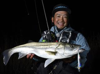 鈴木「スタッガリングスイマー100Sです。この時期のナイトゲームは、バチやアミを筆頭にスローなベイトで、シーバスもアフターが主体。そんな時に、このルアーのアクションとレンジ、サイズが、一番汎用性が高いですね。単純な飛距離でいえばトライデントのほうが飛ぶけれど、あそこまで細いと千葉の河川ではフォール速度が速くなりすぎて使う場面が限られます。スタッガリングスイマー100Sなら、浅い場所でも使いやすいし、アップ~ダウンまでどんな使い方でも仕事をしてくれます。カラーは、ずばりチャートバック。この色は、魚の反応を一番速く出せるんですよ」