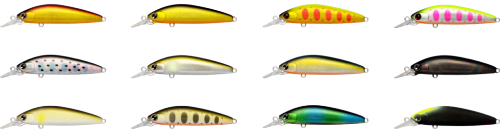 左上から右に、赤金、金黒、イブキ 、メブキ 、ヤマメ、アユ、クラシック、チタンブラック、パールアユ、パールヤマメ、ピーコック、マットブラックチャートヘッド【スペック】