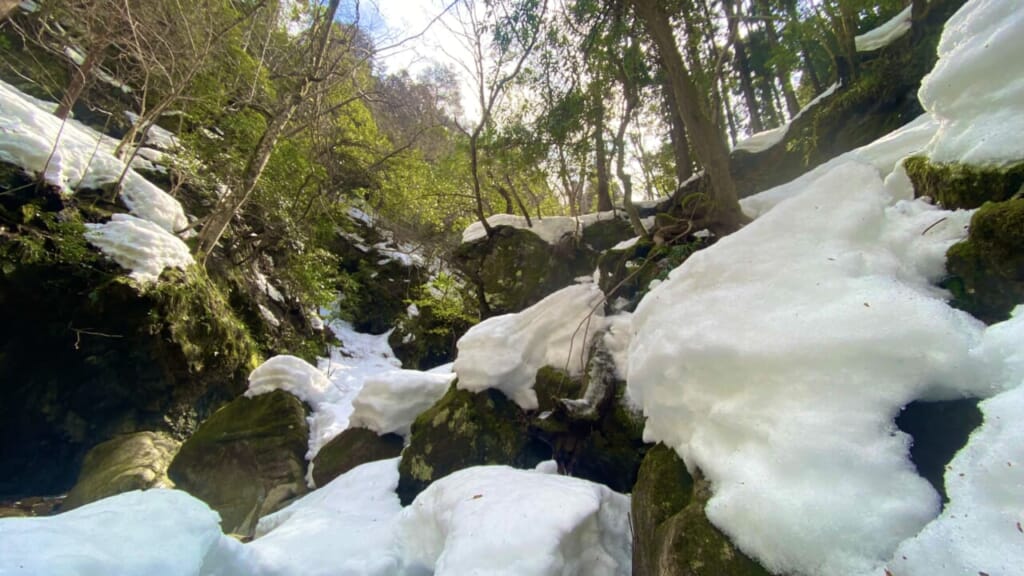 渓にはまだ沢山の雪が残っていました。普段であれば目的のポイントまで、車を降りてから歩いて40分ほどで着きますが、降り積もった雪に足を取られ、うまく前へ進めません。