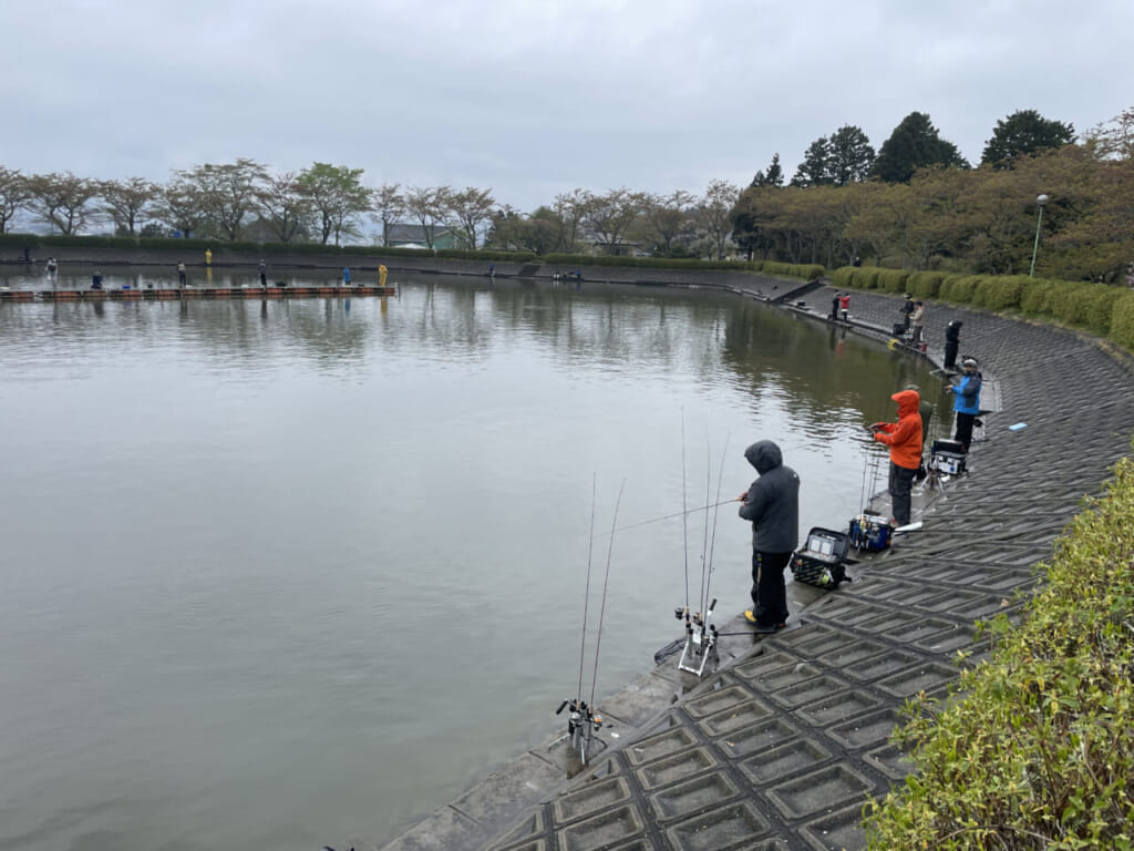 朝から春雨がシトシト模様の体感気温25度以上という、初夏の陽気がしばらく続いた後の台風通過による強風、悪天候ということで、まさに三寒四温……気温&水温の乱高下は結果としてアングラーの出足を遅らせることに。ポンドはナイーブな個体が多かったのか、なかなか口を使ってくれない状況……。そんな中でも、出ました、大物!