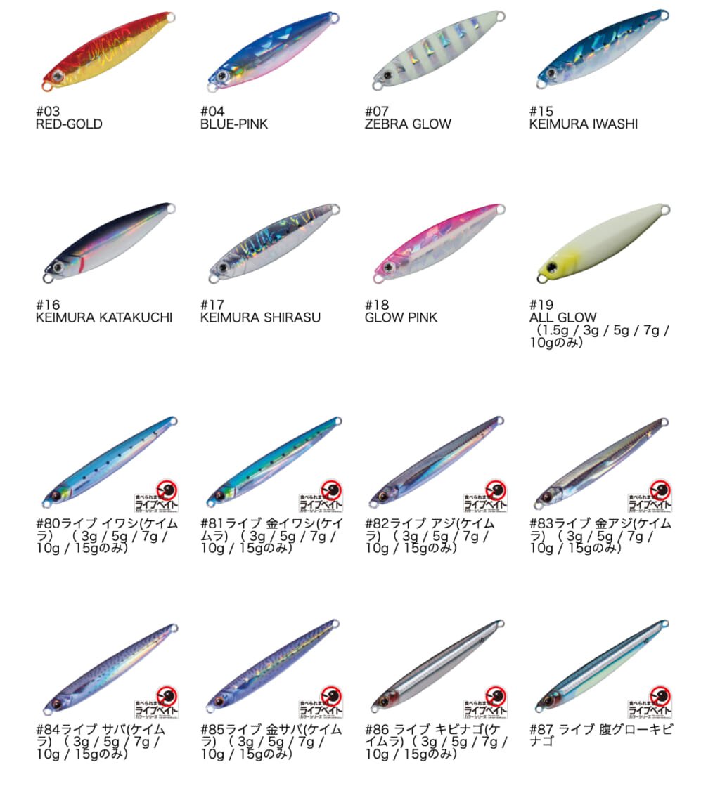 - color:1.5g:8色 3〜10g:16色 15g:15色 (ライブベイトカラー8色)
