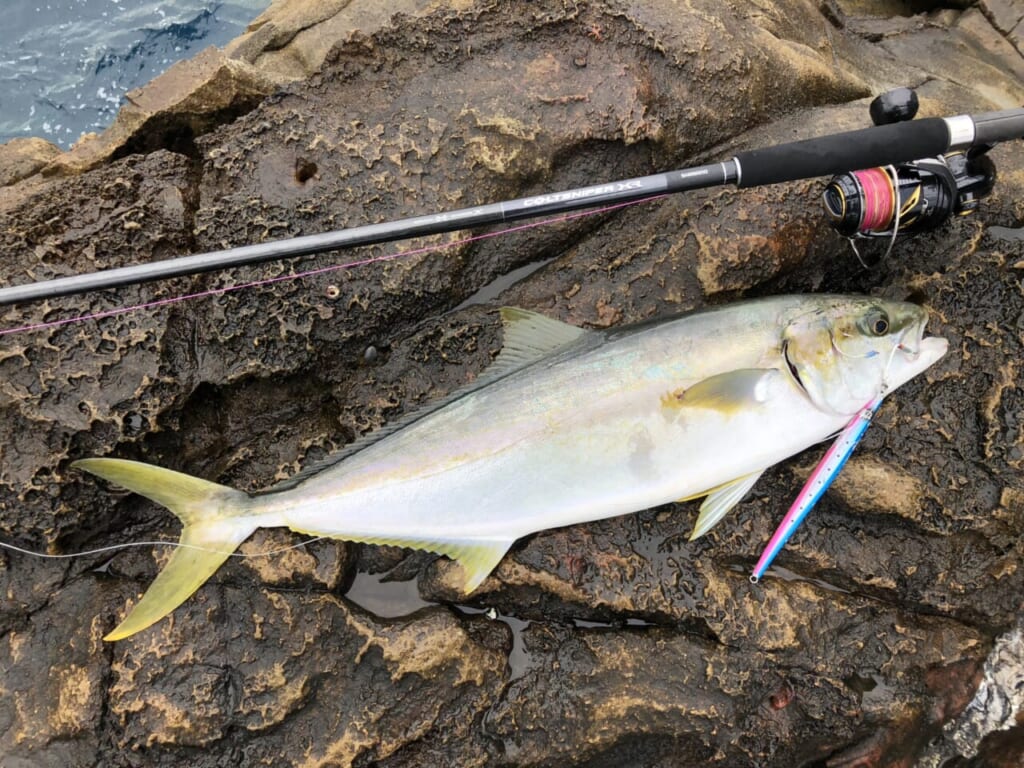 上五島でのった沖磯はご覧のような状況。上津原「水中に磯際から張り出すタナがあって、その先に沈み瀬がある。面積が広いタナは払い潮が当たる面をタイトに探ります。沈み瀬は、その先に投げて沈み瀬の裏側、上面、流れが当たる面と、瀬をなめるようにタイトに攻めます。当て潮に変わっても好スポットの要素を備えています」