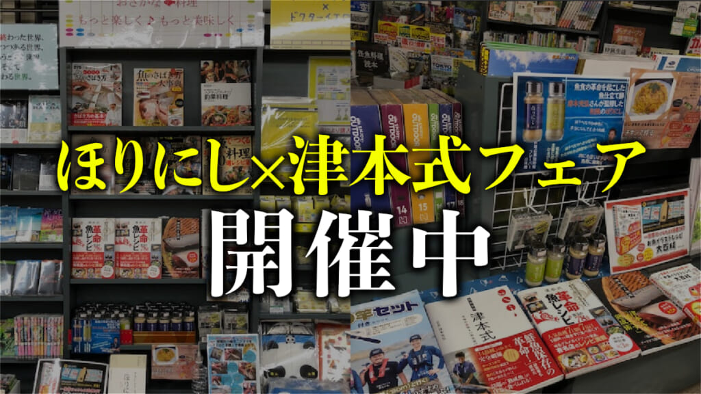 1階では、ほりにし×津本式のフェアが開催中。アウトドアスパイスはもちろん、夏のオンシーズンに向け、魚の血を簡単に抜けるノズルなども販売中です。