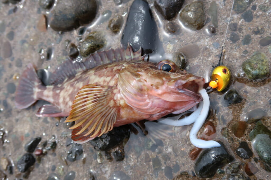 西村がカサゴをキャッチ! 「イカをツインテール風につけたのが効いたのかも!?」