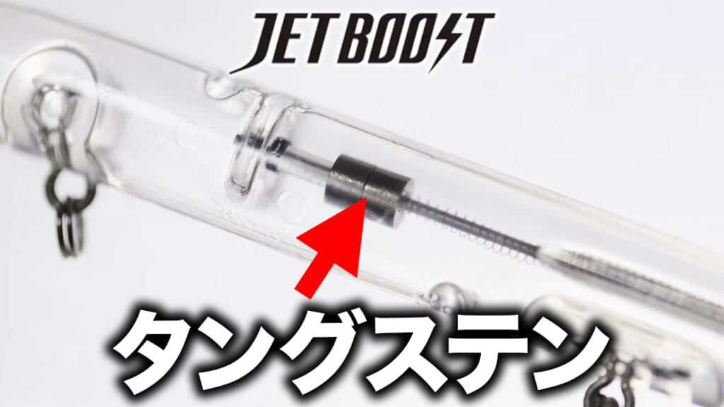 エクスセンス ランザ120F ジェットブーストに搭載されるジェットブーストは特別仕様の設計。その秘密がタングステンウエイトの直径で、シマノの他のルアーは5mmや6mmといった、少し大き目のタイプを搭載する一方で、このルアーには直径4mmのタングステンウエイトを特別に設計。