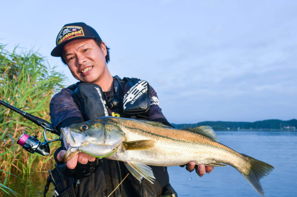 田口さんが現在開発しているプロトのシンペン。長さは86mmで重さは30g弱。80m以上飛ばせる遠投性能があり、ファットなボディによる浮力があるため遠距離でもシャローを引ける。ただ巻くだけで自動的に食わせのチドリアクションを発生。