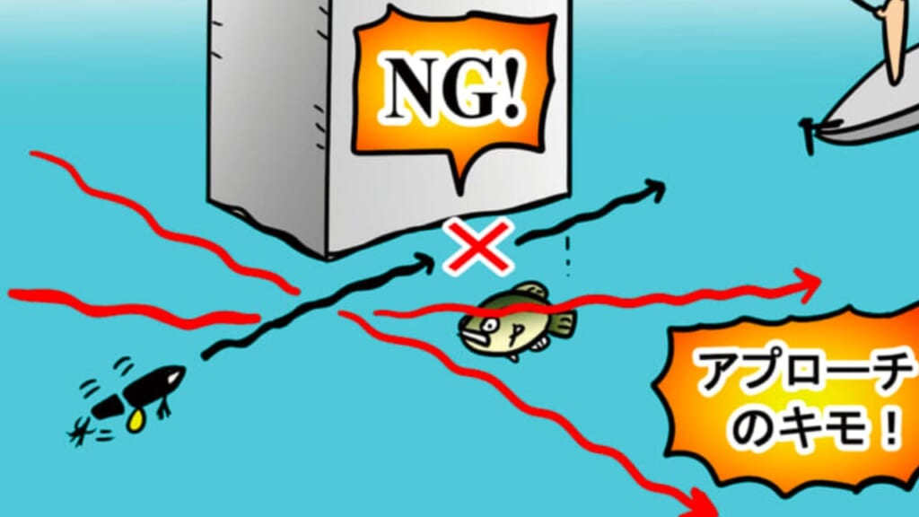 「バスが気づかないところに着水させて、真横もしくは斜めうしろから、突然現れたように引くのが基本。ただし身体の上にルアーやラインを通さないように注意してください」