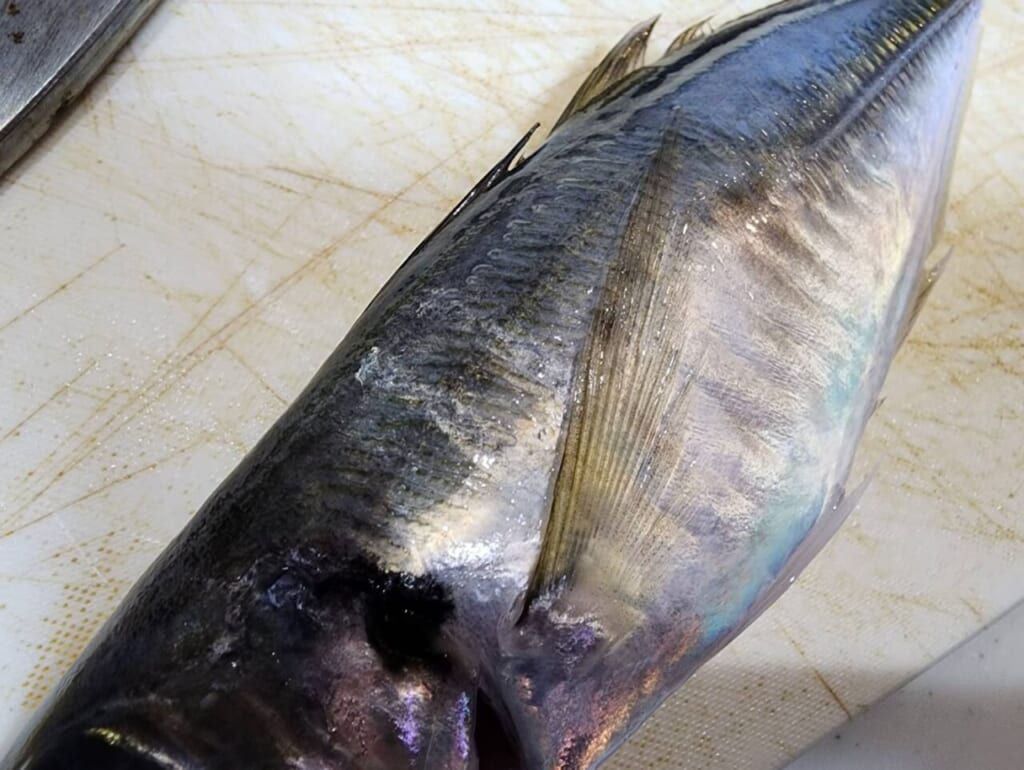 従来のアジバサミの場合、暴れるアジを無理やり挟むと見るからに体表面に傷つくこともあったが、宵姫アルミフィッシュグリップは少し跡があるかな?程度。皮を引いた身にも特段傷は見当たらなかった。