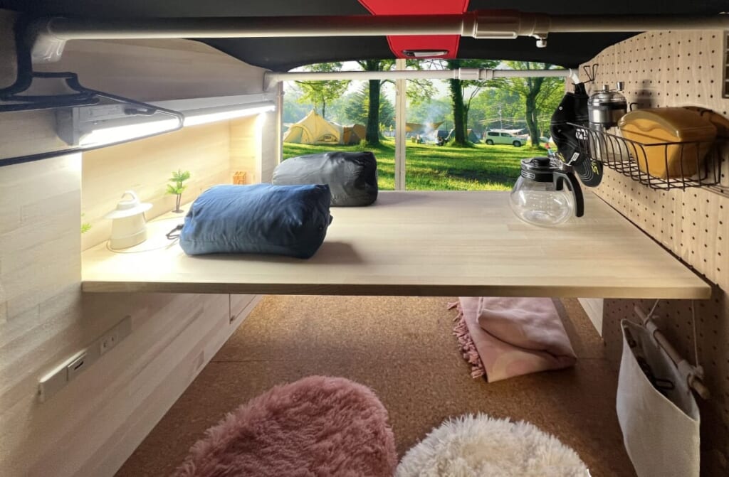 LED照明で暗い夜も車内を明るく照らすので、車中泊、キャンプ時に安心。朝マズメに合わせて前入りしても、車内でゆっくり仕掛けの用意ができる。