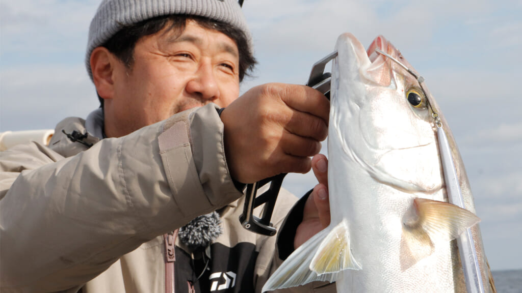 スイムチョッパーの重みをロッドの胴、バットを曲げるようにシャクりあげると、理想の動きを生み出せる。ジグが自走し、自走している間はスラックが出続ける。そうやって動かし方を解説してもらっていると、写真のカンパチが飛び出た!