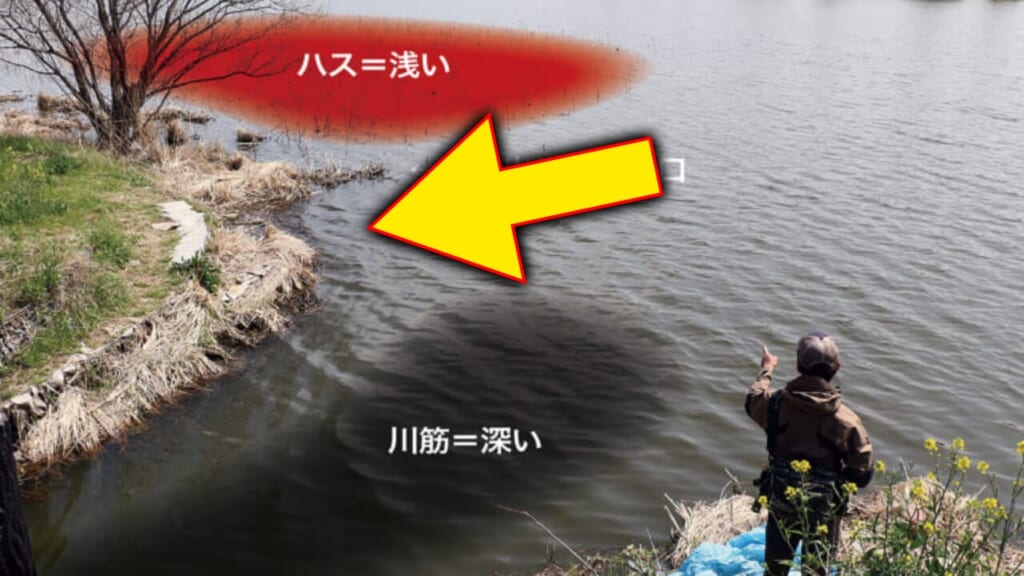 「時期的にはシャローにいてもおかしくないタイミングです。ただ、今日は少し冷え込んでいるし、ヘラブナが岸際でハタきはじめているのを考慮すると、だらだら浅いところは望み薄かな、と。カバーが沖に張り出しているところなら、バンクと一段下の両方を探っていけます」
