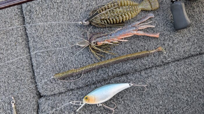 それでも数は重ねていき、夕方。この日開催されていたトーナメントにより、多数のボートが浮いていると聞いていた下流域が空いていました。ハードボトムに投じた佐藤のリズィーアピールプラスにキャットフィッシュとバスが連発し、ボクも同ルアーを投じるとヒット!