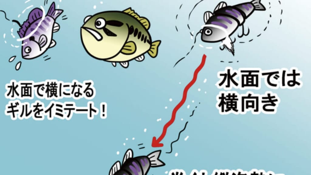 キャストしたらまずは放置。2~3回リーリングして、また放置するの繰り返し。ブルーギルのエサ釣りで、バスから逃げたギルが水面まできて、竿で引っ張られてまた泳ぐ、このときの動きを意識しながら使ってみよう。