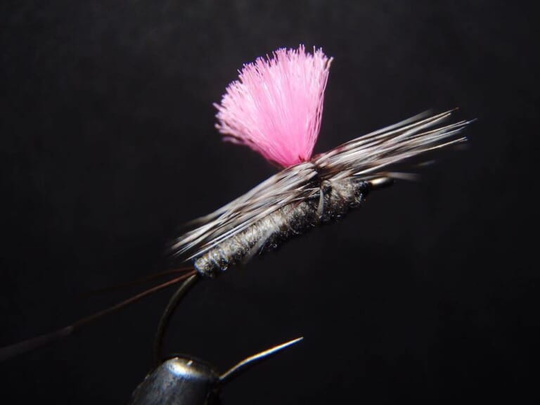 水面に浮いていても、上のインジケーター(目印)のおかげで視認しやすいドライフライのパターン(種類)のひとつ『パラシュート』(タイヤー:高橋章さん)