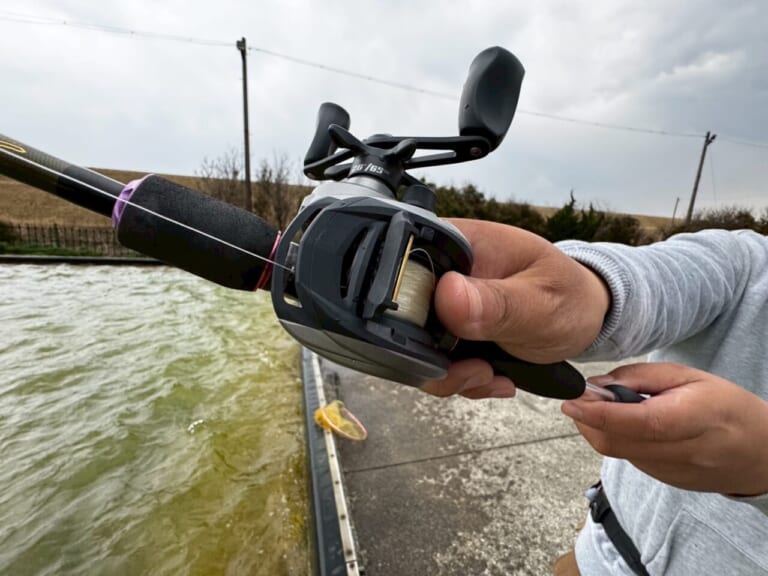 推奨ルアーウエイトが7g以上とのことではあったが、5g程度のルアーや3.5gシンカーを使ったフリーリグなら普通に投げることができた(使用していたロッド的にはきつかったが…)。また、2ozクラスのビッグベイトを投げてもブレーキはしっかりとかかり、バックラッシュを抑制してくれていた。