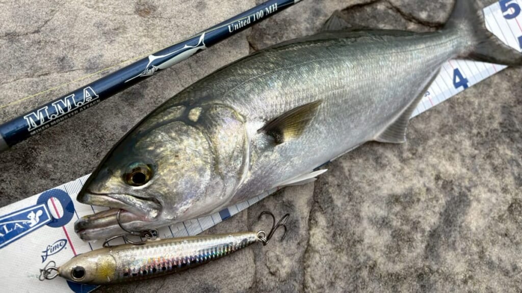 今回使ったロッドは、ツララの「M.M.A United 100MH」。仕舞寸法81.5cmのパックロッドなので、電車移動や遠征でも扱いやすく、ヒラスズキやブリ狙いにも対応できる万能モデルです。