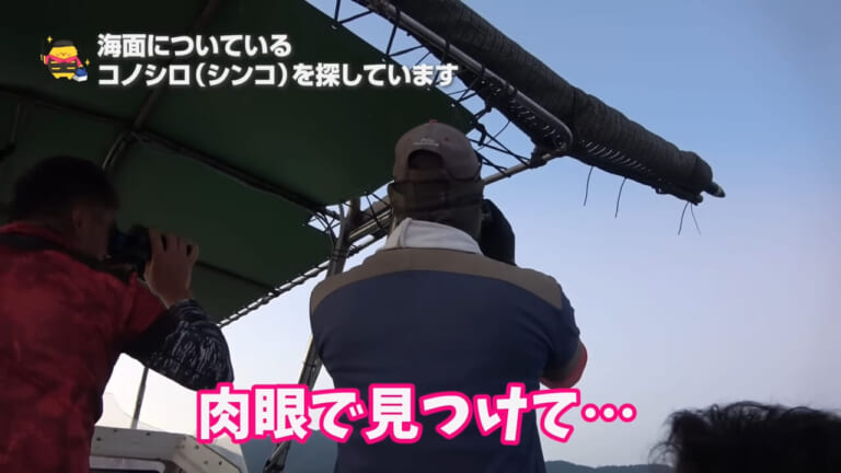ドローンで撮った映像にはコノシロの大群が映し出されていた。有明海が豊かな漁場であることがわかる。そして網を投じた瞬間、コノシロの群れが沈む映像に漁師さんたちも興味津々。
