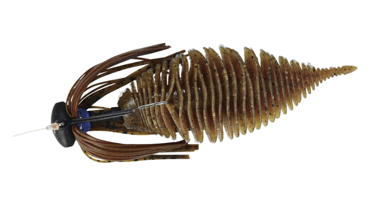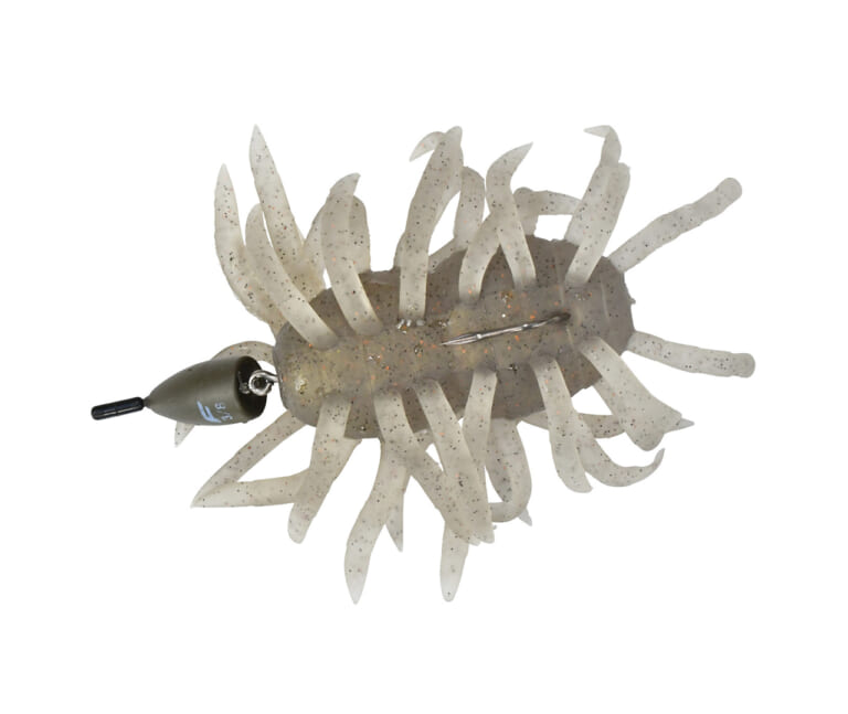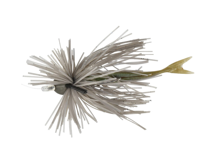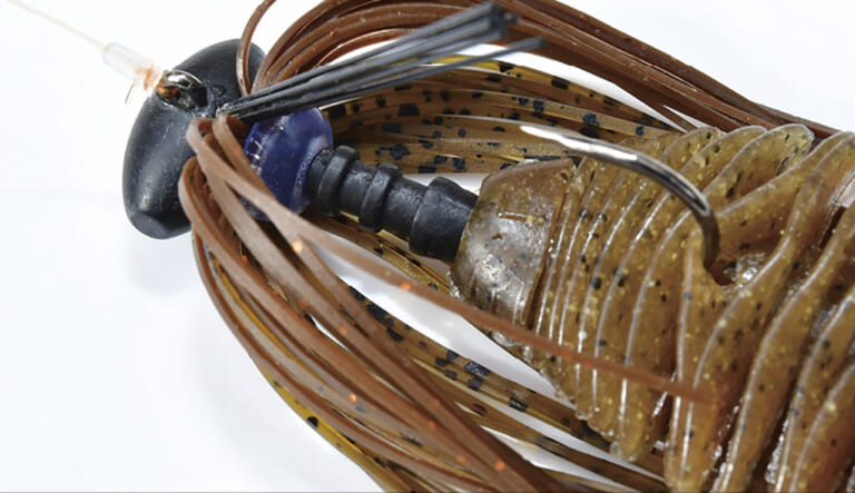 「相模湖で強いのがこのセッティングです。スカートがフレアするようにゴムワッシャーを装着して、ベローズギルをチョン掛け。スカートが水中で綺麗に舞いながら、ベローズギルが“チュるん”としたアクションをしてくれます。結び目は引っ掛かり防止で、シリコンチューブを付けています」