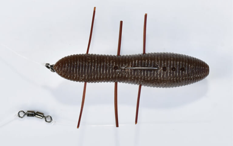 「バスが冬に捕食していることが多いと言われる水生昆虫のヤゴをイミテートして、六本の足になるようラバーを刺しています。ジャーク時のキレを上げるためにフックアイのところにスプリットリング、沈みを早くするためにスイベルを入れています。シンカー的な役割です」
