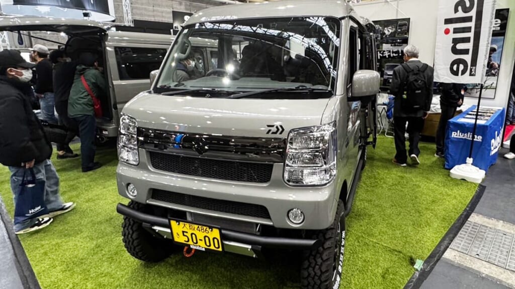 釣りフェス2025に展示されていたエブリイの軽キャンパー。ブロックタイヤの装着やリフトアップなど、小さなクロカンと言っても過言ではないほど造りこまれた1台だった。