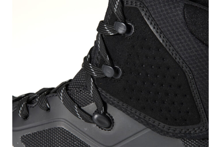 さらに嬉しいポイントが、シューレースフック採用のおかげで、足首周りの締付がスムーズに調節でき、フィット感を自在にコントロールすることが可能に。この部分はプラスチック製のため、サビの心配もいらない。