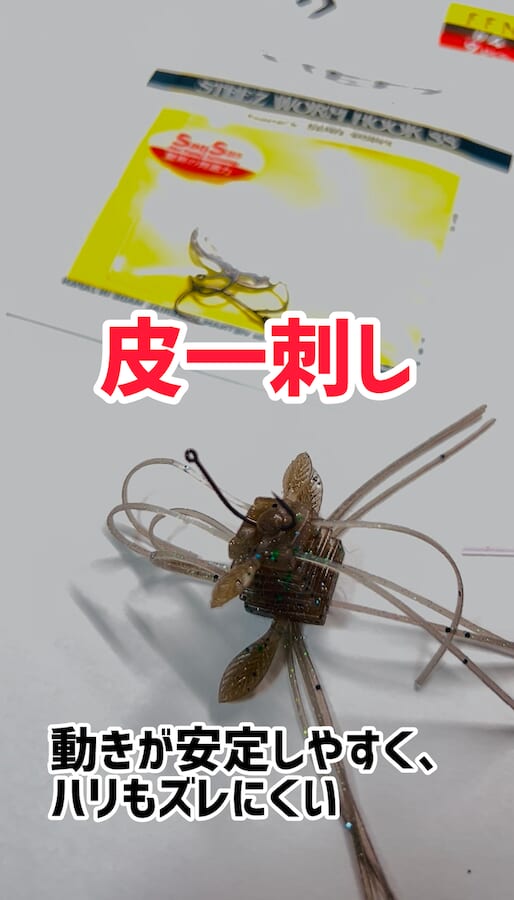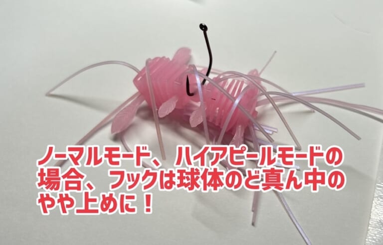 フックの刺し方によってアクションや波動の強さが変わります。このあたりは好みの世界なので、お好みの方で試してみてください。