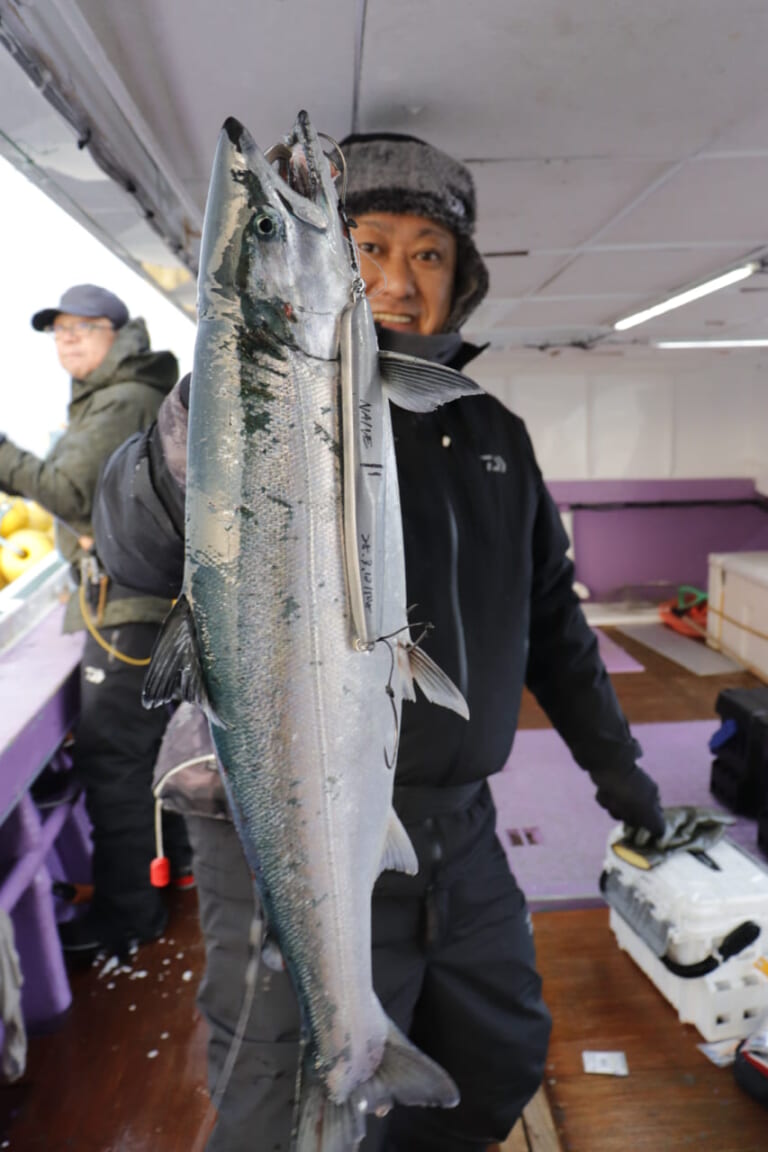 清水氏より先に同船していた佐藤テスターがサクラマスをヒットさせたのは予想通りのレンジ付近。レンジが絞れた、というよりは潮目までのレンジが有効と確信できたと同時に、目線はサクラマスに掛かったアシストフックへ向かった。