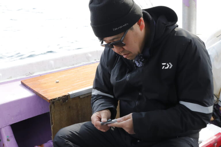 船上での貴重な情報収集に余念がない。すぐさま清水氏はフォール主体のアクションから、細かなピッチの巻き上げにアプローチを変えるのだった。