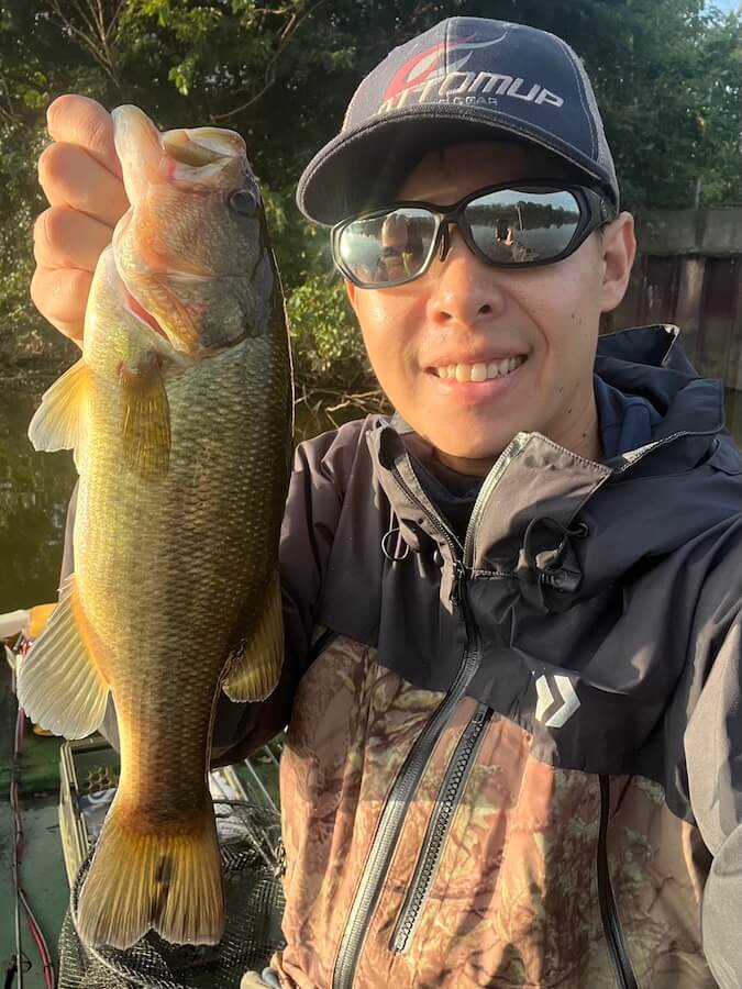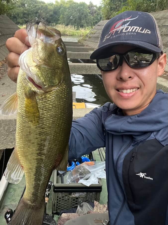 朝イチから将監川を上り、地蔵橋を越えた所から釣りスタート。朝は水位が高いこと、流れも発生していたことから、流れの当たるカバーの先端にスクーパーフロッグ(3.5gジグヘッド)を吊るして、早々に33cmをキャッチ!