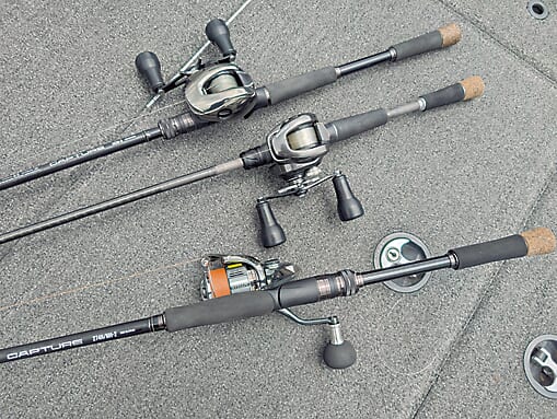 さめうら湖でメインに使用したロッドは、今季から奥田さんの相棒となった『キャプチャー』のベイトとスピニング各1モデルの計2モデル。一方のベイト『163H-5』は「ビッグベイトなど大型ルアーをしっかり乗せて投げやすく、ショートレングスだからこそ精度の高いキャストや繊細な操作も付けやすい。ボート釣行のみならず、小規模フィールドの岸釣りでも使いやすいね」。もう一方のスピニング274MH/H-2』は「バンタム274MHをブラッシュアップ。ティップがフレキシブルでシェイキングしやすい一方で、カバー周りでも大型に負けない最強クラスのパワースピンやね」。今回もワンビッグを獲る準備は万全だ。