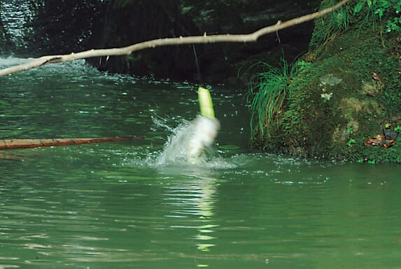 枝越しのミスキャスト時でもチャンスは無駄にしない奥田さん。周辺に見えた個体にアピールすべく上下を繰り返すと何と!「ソフト素材のテールだからこそ、水中でうまくアピールできているんやろね」。ビッグベイトが吊るしで釣れるシーンを見れるとは!