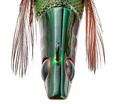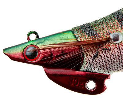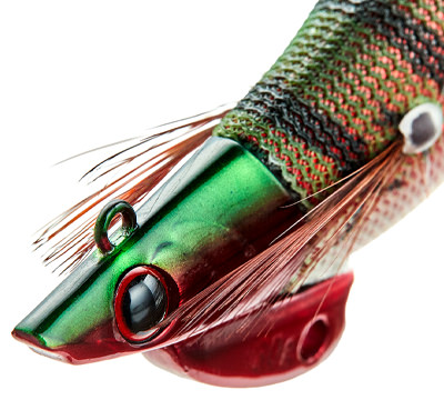 アオリクスTRのもっとも特徴的な部分と言えるのが、見た目にもシャープで薄型のヘッド形状。抵抗が少ないので水を切り裂くようにタテ姿勢で素早くフォールし、あっという間にボトムへと到達。着底姿勢はヘッドだけが海底に着いて、テールは斜め上方向の状態をキープできるので根掛かりしにくく、効率的なボトム周辺のサーチが可能だ。
