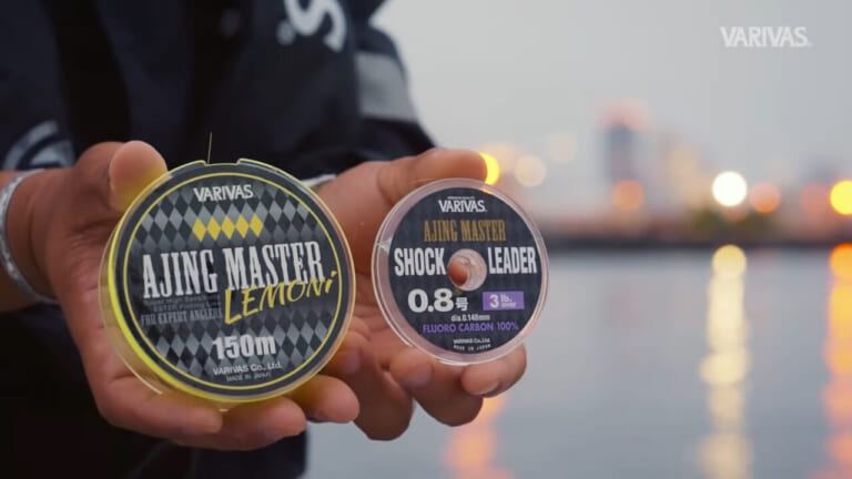 池上さんがアジングの初中級者に推奨するラインシステムがアジングマスター[エステル]レモニーとアジングマスター ショックリーダー[フロロカーボン](ともにVARIVAS)の組み合わせ。