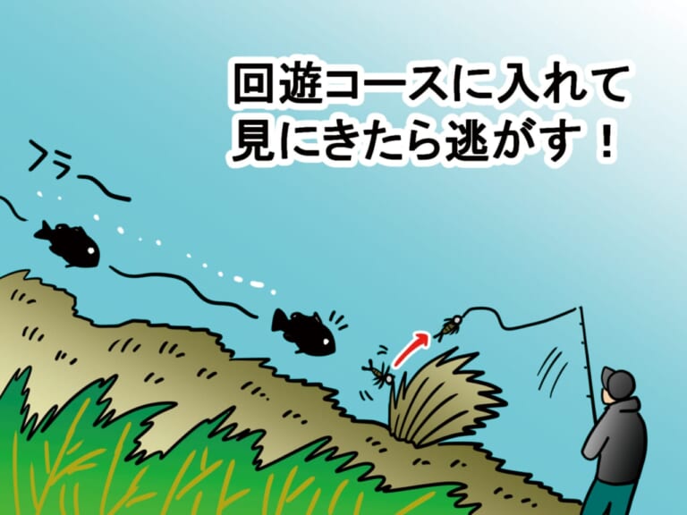 じっと動かず地蔵スタイルでバスを待ち伏せ。C4ジグ&ハンハントレーラーをあらかじめ入れておき、バスが回遊してきたタイミングで食わせの逃し。「先制パンチじゃないですか? いいジャブが撃てたと思います!」。