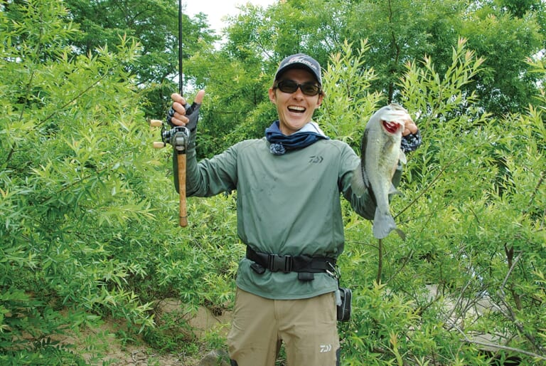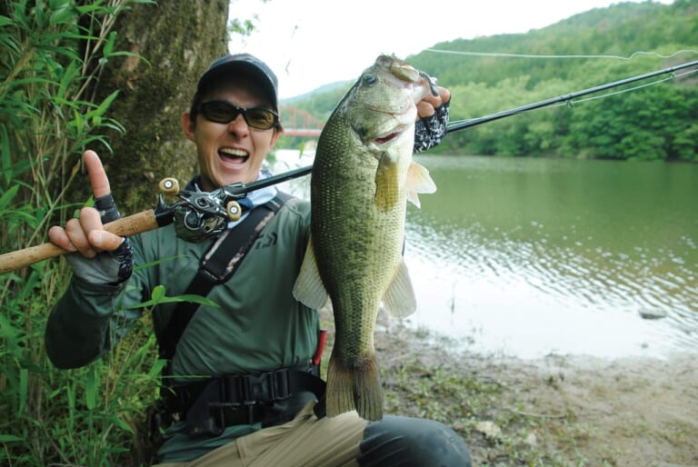 2本目を釣った少し下流、サイトは得意ではないと言いつつ、見つけたバスを難なく口を使わせた。またしてもC4ジグ&ハンハントレーラーだ。「これはいいサイズ! この魚は、僕は本湖では獲れないんですよね。手が震えてますよ!」