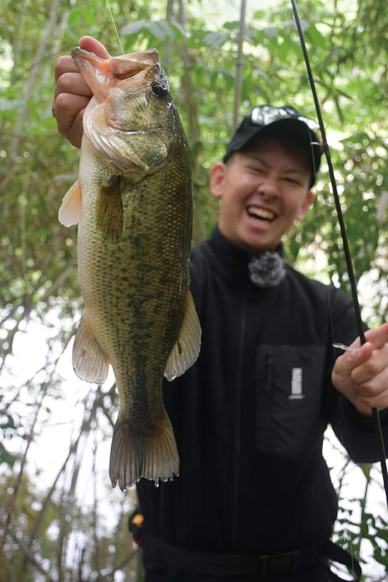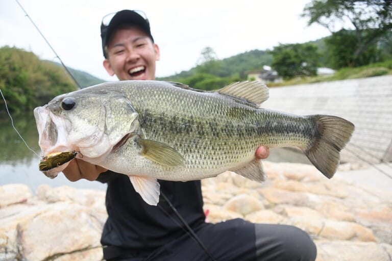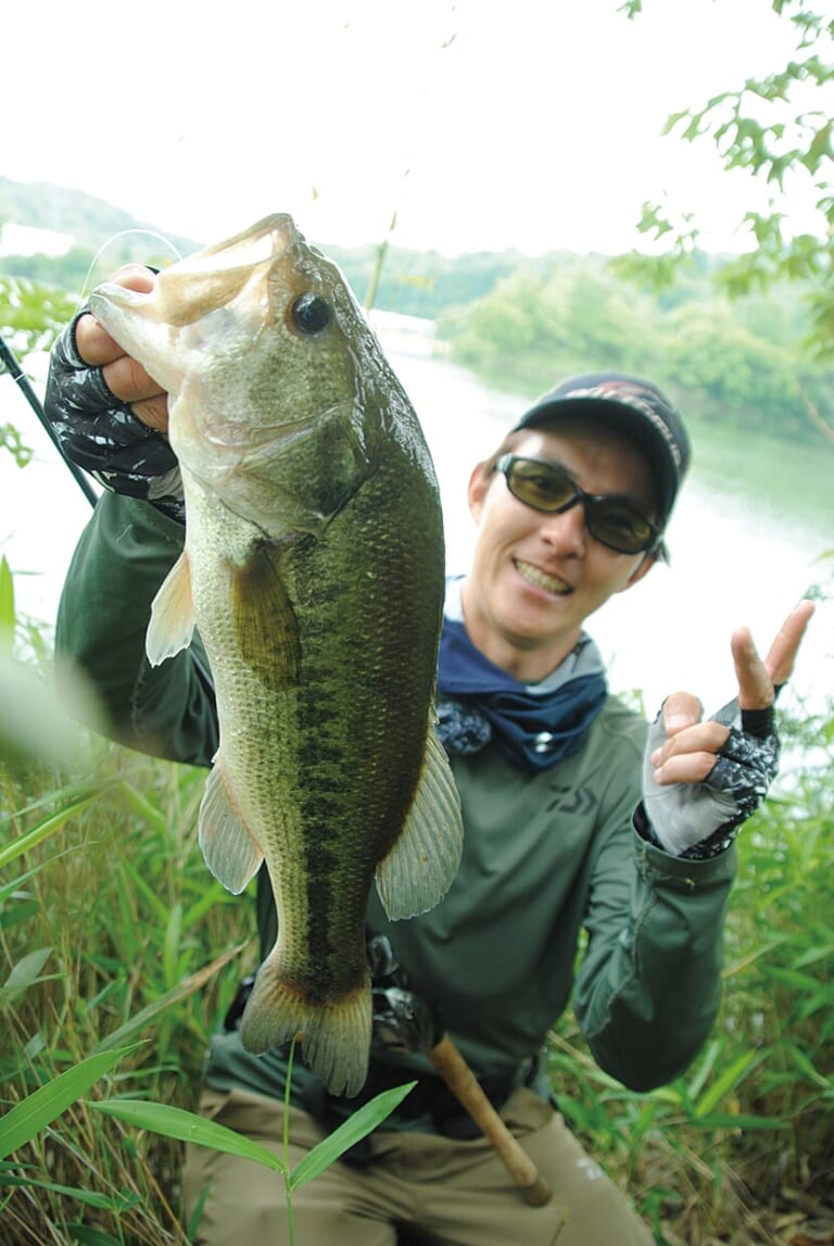 流量は少ないが、ほかより規模が大きく複雑なカバーが絡む中流域左岸のインレット。練習では流れの中にバスの姿を確認したが、さらに流量が減ったと見るや本流側へアプローチ。変化への即座の対応が1本目へと繋いだ。
