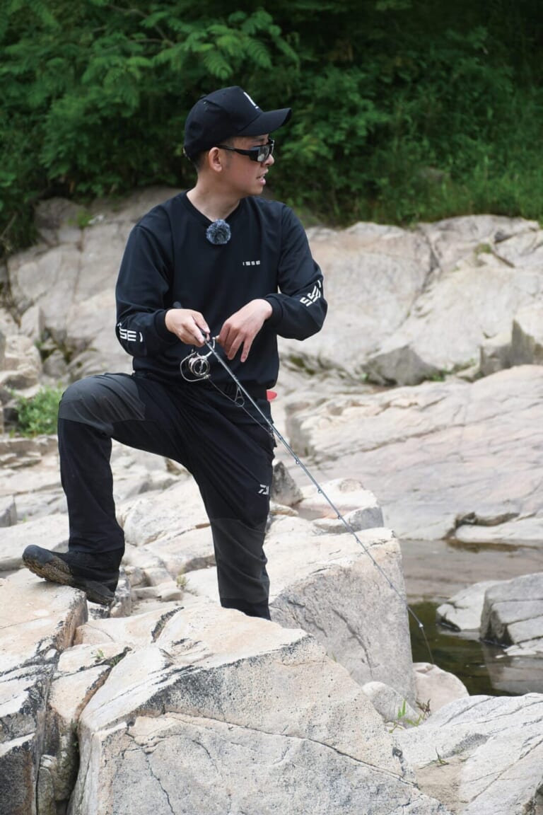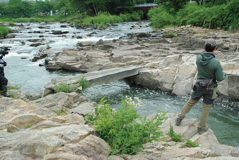 石橋下50センチほどの隙間をスキップで通過させ、なおかつ滝壺までは全10メートル超の距離。川村さんのキャストスキルも際立った。なお、陸王ルール上、エリア外へのキャストは違反とはならない。