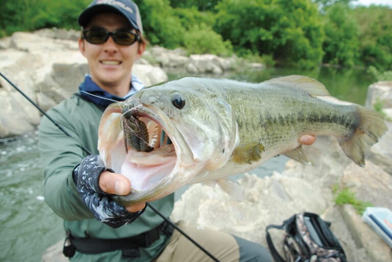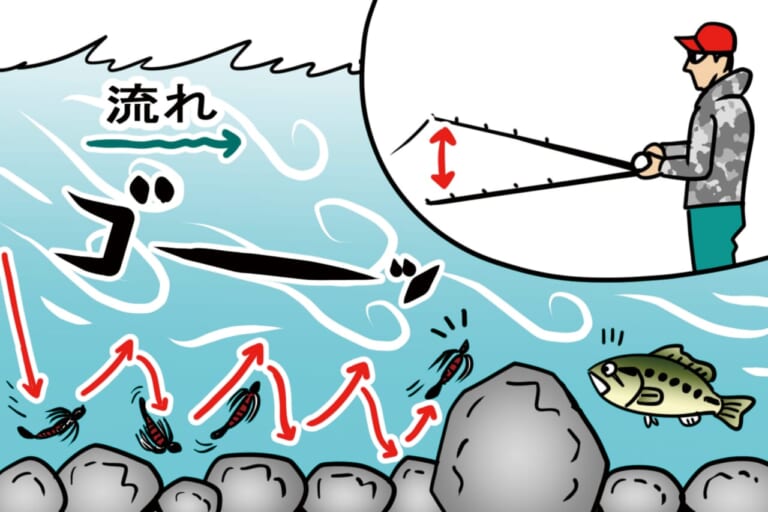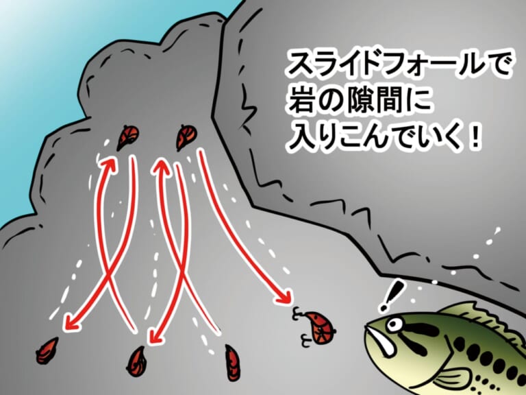 水が強く流れる最上流部、そのヨレの部分に入れてリフト&フォール。「ザリメタルはスライドフォールするので、岩の隙間にも落ちていくんです。シャクると、岩の隙間からバスの目の前に急に出てくることになる。この釣りはフォールではなく、リフトで食いますね」。