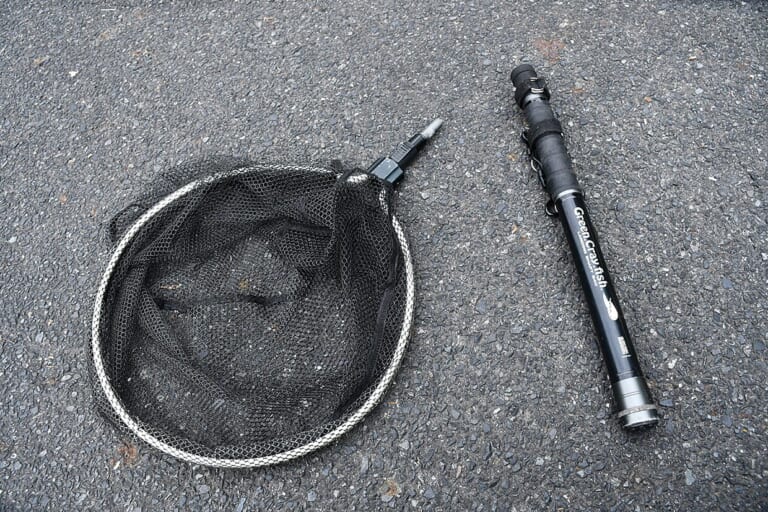 2本目を釣ったときにランディングネットが破損。柄が取れて修理不能に。3本目はネット部分を直接持って強引にランディングした。「陸王は予想外のことが起こりますね…」。