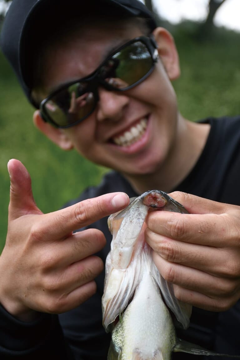 バスの下顎には傷があり、これはボトムのエサを食べる際についたものだという。「これはエビ・ゴリ食いの証拠なんです。こういうバスを釣るのは得意ですよ!」。