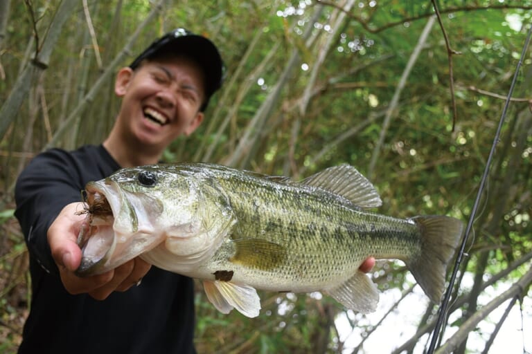 バスの回遊コースを読んで事前にスモラバを入れておき、細かくロングシェイク。バスが近づいてきたら逃しのアクションを入れて食わせるのが今回のパターン。竹やぶでもオープンにある冠水ブッシュまわりでも同様に機能した。