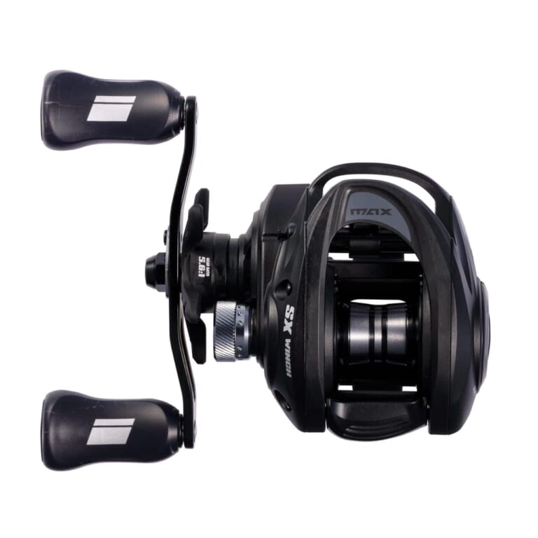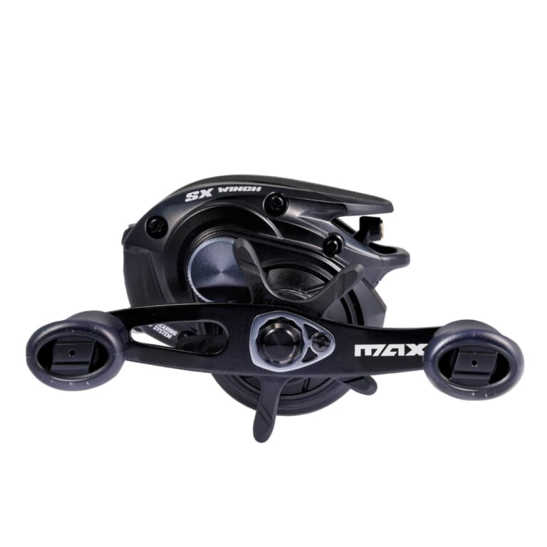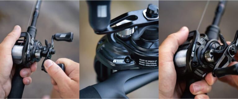 ノーマルモデルのMAX5 SXのギア比が6.8:1なのに対し、この“ウインチ”のギア比は5.6:1という低めのギア比を採用。ギア比が低い=パワフルな巻き上げが可能ということなので、例えば5mレンジまでカバーする大型ディープクランクや、10m以深のディープレンジをスローロールで攻めるヘビースピナーベイトなど、ギア比が高めなベイトリールでは重くて巻きにくい状況でも、ウインチならパワフルかつ安定したテンポで巻き続けることができる。