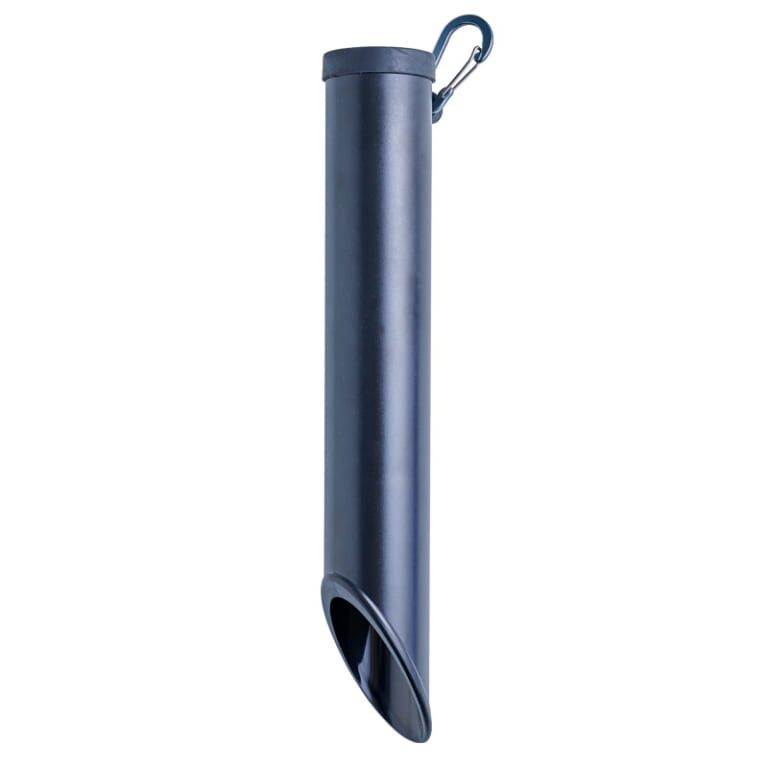 このサオホルダーは砂浜に差し込んで使うタイプで、スラッシュカット形状の下部を真っすぐに差し込むだけで固定完了。材質は軽くて強度があるポリカーボネートを採用、カラビナが付属しているのでバッグやライフジャケットのD管に接続すれば持ち運びにも便利だ。
