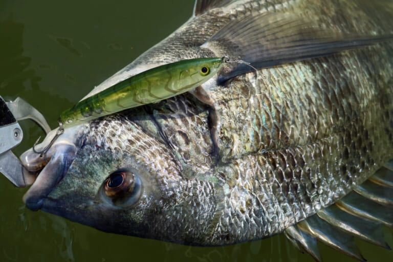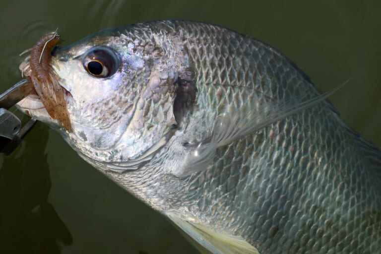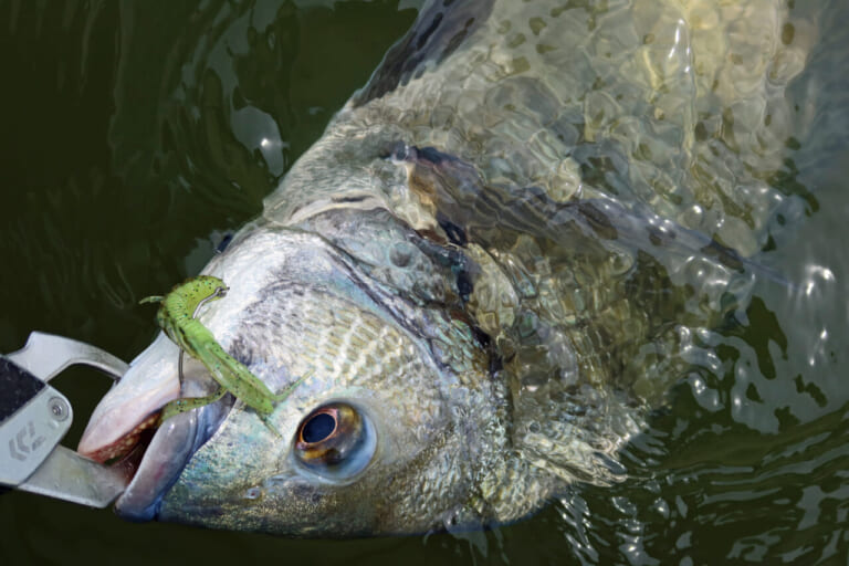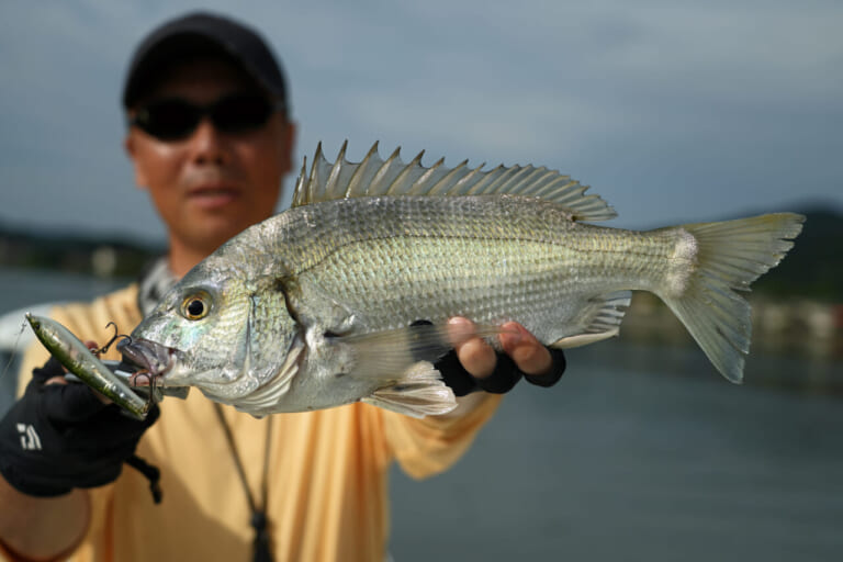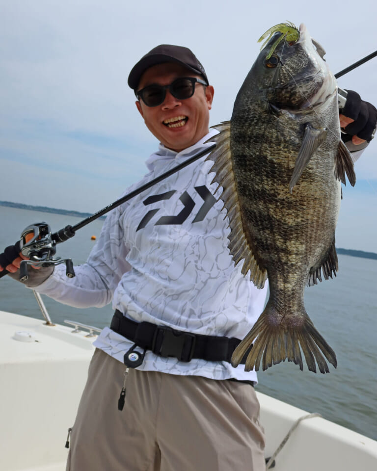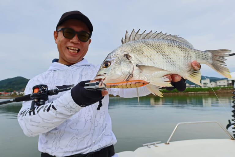 前日の雨の影響で濁りが強く、トップには厳しい状況でしたが、状況に反してキロアップのクロダイやキビレを多数キャッチ。以前からロコアングラーの方々からも要望をいただいていた透過系シュリンプカラー。各地のフィールドでも活躍すること間違いなしです。
